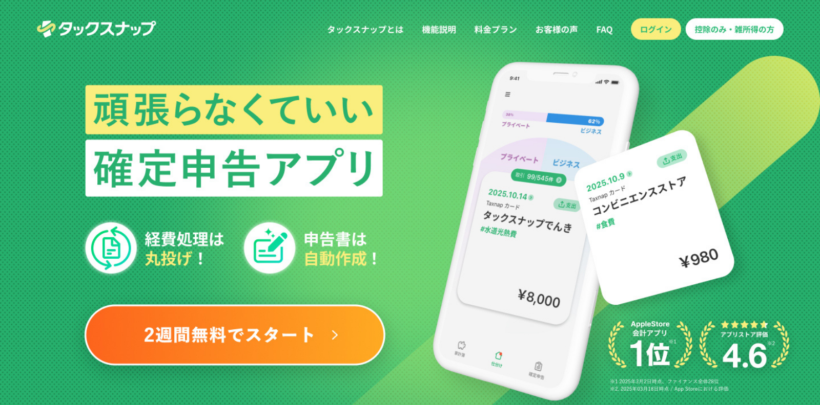 タックスナップは、フリーランスや個人事業主のために開発された画期的なクラウド型会計ソフトです。スマートフォンだけで経理や確定申告をスムーズに完結させることができ、ユーザーの利便性と安心を両立した設計が特長です。
